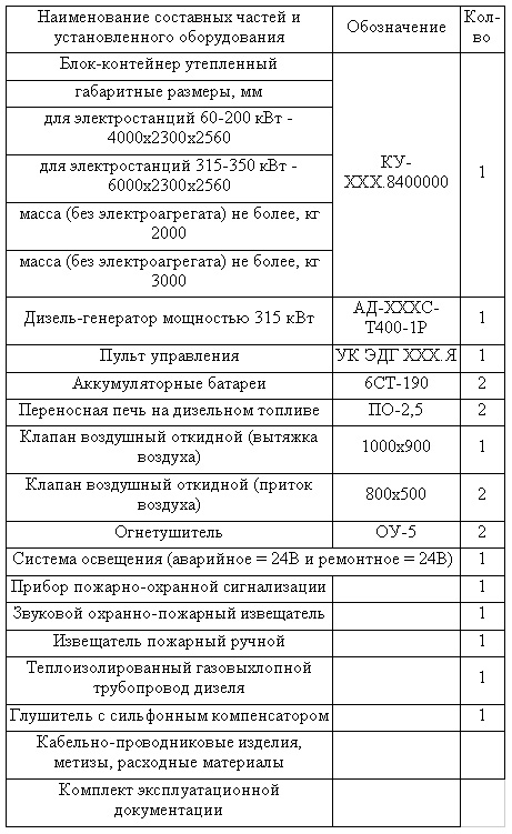 Система жизнеобеспечения блок-контейнераСистема воздухозабора и ручной вентиляции обеспечивается двумя впускными окнами и одним выпускным проемом. Впускные окна и проем содержат устройства для фиксации в полуоткрытом положении, окна могут быть сняты при повороте на 180 градусов вверх. Система газовыхлопа оборудуется газовыхлопным трубопроводом дизеля и глушитель с сильфонным компенсатором, смонтированными внутри контейнера. Данная конструкция позволяет уменьшить шум при работе установки, исключить выступающие части, а также необходимость дополнительного монтажа системы выхлопа на объекте. Выхлопной трубопровод двигателя полностью теплоизолирован. Система освещения. В стандартной комплектации контейнер оборудован плафоном с лампочкой 24 В и проводкой с выключателем. В комплекте поставки имеется переноска с подключением к розетке 24 В шкафа управления электроагрегатом. По техническому заданию заказчика может быть установлено любое количество плафонов различной мощности как от аккумуляторных батарей, так и от внешней сети ~ 220 В. Система внутреннего обогрева состоит из двух переносных печей на дизельном топливе ПО-2,5. Предназначена для обогрева внутреннего пространства контейнера и запуска электростанции в холодный период времени. Возможна установка вместо дизельных печей: - отечественных подогревателей жидкостных предпусковых ПЖД-30 или ПЖД-600 с ручным запуском - импортных подогревателей Webasto модели DBW300.59 с ручным и программируемым запуском. Система пожарно-охранной сигнализации подключается к системе аварийной сигнализации и защиты электроагрегата (параллельно датчику сигнализатора температуры масла). При превышении температуры в контейнере выше допустимой (70-90°С) будет выдан сигнал на останов электроагрегата с отключением нагрузки и на аварийную световую и звуковую сигнализацию. На панели блока защиты шкафа управления электроагрегата высветится индикация «температура масла». Состоит из прибора приемно-контрольного охранно-пожарного «НОТА-2», звукового охранно-пожарного извещатель «Свирель-2» и извещателя пожарного ручного «ИПР 513-3», расположенного на внутренней стороне контейнера и датчиков. Щит собственных нужд предназначен для управления системой пожарно-охранной сигнализации и другими системами контейнера. Система ручного пожаротушения состоит из двух огнетушителей ОУ-5. Аккумуляторные батареи. Установлены АКБ типа 6СТ-190 (2 шт.). Предназначены для питания стартера, системы пожарно-охранной сигнализации, а также системы рабочего и ремонтного освещения. Технические характеристики блок-контейнера электростанции приведены в Таблице 1. Таблица 1. Основные технические характеристики. ![]() Контейнерные электростанции первой степени автоматизации отличаются функциональностью и качеством исполнения. Контейнер изготавливается в 2-х стандартных типоразмерах для электростанций мощностью 60-200 кВт и 315-350 кВт. Блок-контейнер представляет собой цельнометаллическую конструкцию по ГОСТ 20259-80, в составе которой предусмотрены следующие конструктивные элементы: