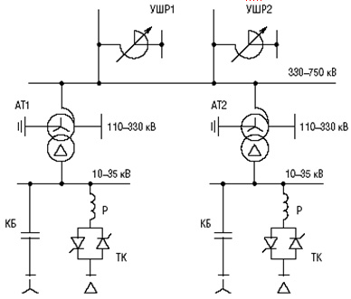 Как следует из Схемы. 2, СТК состоит из трех основных частей-модулей: конденсаторной батареи КБ, коммутируемой выключателем или тиристорным вентилем, компенсирующих реакторов Р, мощность которых изменяется с высоким быстродействием за счет фазового управления тиристорных вентилей ТК. Модульное построение СТК позволяет осуществить их внедрение поэтапно. В слабозагруженных сетях на первом этапе достаточно включить в работу реакторную часть СТК в виде отдельных вакуумно-реакторных групп ВРГ, коммутируемых вакуумными выключателями с высоким ресурсом. По мере роста загрузки линий, когда от источника реактивной мощности требуется ее генерация, дополнительно к реакторным группам подключаются конденсаторные батареи, а для быстродействующего регулирования мощности реакторов – тиристорные вентили, что образует полную схему СТК. Такое решение опробовано на ПС 330 кВ Новосокольники, Старо-Русская, Великорецкая и Советск МЭС Северо-Запада и ПС 500 кВ Амурская МЭС Востока, а также ПС 500 кВ Балашовская МЭС Центра. Выполненные МЭС Северо-Запада сетевые испытания показали: