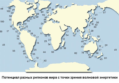 Потенциал разнх регионов мира с точки зрения волновой энергии
