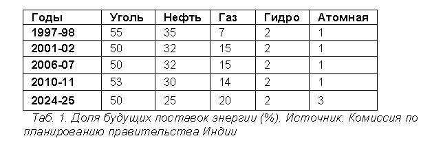 Такие вопросы, как энергетическая безопасность, использование альтернативных видов топлива, взаимозаменяемость технологий жизненно важны для того, чтобы обеспечение различными источниками энергии, используемыми в экономике, было оптимальным и устойчивым – а так же для того, чтобы энергия продавалась по экономически обоснованной цене чистых и «зеленых» видов топлива, доступных индийским потребителям. Сметный план энергоснабжения Индии на период до 2025 года приведен в Таб. I указанной Программы. Нефть и газ по-прежнему играют первостепенную роль в удовлетворении энергетических потребностей страны - 45% от общей потребности в энергии будут покрываться за счет нефтегазового сектора.