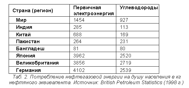Текущий уровень потребления энергии на душу населения в Индии чрезвычайно низок по сравнению с остальным миром. Рост экономики автоматически приведет к росту потребления энергии, поскольку существует прямая корреляция между ВВП и потреблением энергии. Потребление первичной энергии на душу населения и углеводородов (Таб. II) показывает, что Индия является одной из самых неразвитых стран по потреблению углеводородов в нефтяном эквиваленте. Поэтому НГК очень важен для энергетической безопасности страны.