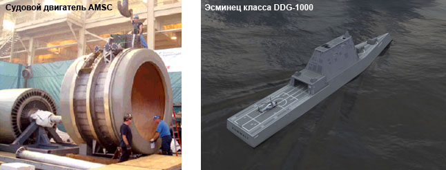 Исполнительный директор компании Грегори Юрик (Greg Yurek) предполагает, что новое направление послужит катализатором ускоренного внедрения ВТСП технологий в энергетические системы. Он считает «Проект Гидра» удачным соединением трёх идей: концепции Министерства национальной безопасности – вложение средств в инновационные энергетические технологии для повышения уровня безопасности энергосетей; концепции Con Edison – внедрение СП технологии в свой энергетический план «System of the Future» для Нью-Йорка; концепции AMSC – коммерциализация СП технологии для нужд электроэнергетики. Генерация энергииЕще одно возможное применение сверхпроводников – в мощных генераторах тока и электродвигателях малых размеров. Обмотки из сверхпроводящих материалов могли бы создавать огромные магнитные поля в генераторах и электродвигателях, благодаря чему они были бы значительно более мощными, чем обычные машины. Опытные образцы давно уже созданы, а керамические сверхпроводники могли бы сделать такие машины достаточно экономичными. Рассматриваются также возможности применения сверхпроводящих магнитов для аккумулирования электроэнергии в магнитной гидродинамике и для производства термоядерной энергии. В 2005 году концерн Siemens заявил о создании первого мощного генератора с использованием высокотемпературной сверхпроводимости (HTS генератор). Мощность генератора составила 4000 кВА. Компания заявила о том, что готова продавать генераторы данного типа. Их стоимость высока, но расчеты показали, что их выгодно применять, прежде всего, в условиях ограниченного пространства, к примеру, на кораблях. Преимущества сверхпроводящего генератора очевидны: его вес и геометрические размеры в два раза меньше аналогичного по мощности обычного генератора. Кроме того, HTS генератор показал большую устойчивость по напряжению при изменении нагрузки и более высокие характеристики с точки зрения потребления реактивной мощности. Сверхпроводниковые устройства в коммерческом и военном флотеСверхпроводниковые технологии чрезвычайно привлекательны для применения на флоте как гражданском, так и военном. Сверхпроводниковые приводы и генераторы отличаются высокой компактностью при массе в 2-3 раза меньшей, чем у традиционных аналогов. Уровень вибраций и шумов также значительно ниже, что важно не только для военных применений, но и для круизных лайнеров и рыболовецких судов. Низкая шумность силовых установок круизных лайнеров способна гарантировать комфорт и тишину во всех пассажирских помещениях при возросшей скорости и вместимости лайнера. Отказ от механических редукторов и переход к прямому приводу гребного винта электродвигателем существенно поднимает к.п.д. силовой установки. Следует помнить также и об отсутствии омических потерь в сверхпроводниках, даже с учетом потребляемой криогенным обеспечением мощности к.п.д. ВТСП электродвигателей выше, чем у традиционных. Однако основной выигрыш от сверхпроводниковых технологий на флоте заключается в невиданной ранее свободе конструирования судна: дизеля (или турбины), работающие на компактные ВТСП генераторы, могут быть размещены без жесткой привязки к гребному валу. Вынос ВТСП гребных электродвигателей в гондолы за пределы корпуса судна не только высвобождает массу места в кормовой оконечности, но и позволяет р