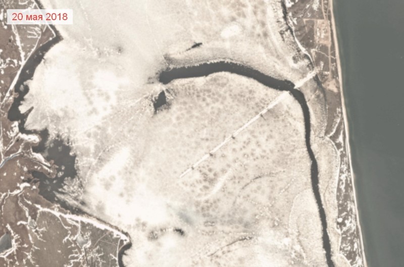 Изучив спутниковые снимки, специалисты «Экологической вахты Сахалина» удостоверились, что до середины мая ледовая дамба перекрывала 2/3 сечения залива и главный фарватер, проходящий вблизи его восточного берега.