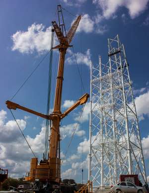 У судостроительного завода «Янтарь» на левом берегу Преголи «Янтарьэнерго» приступило к монтажу четвертого яруса опоры линии электропередачи в виде якоря. Специалисты собрали конструкцию высотой более 60 метров, выполнив свыше 50 процентов монтажа.