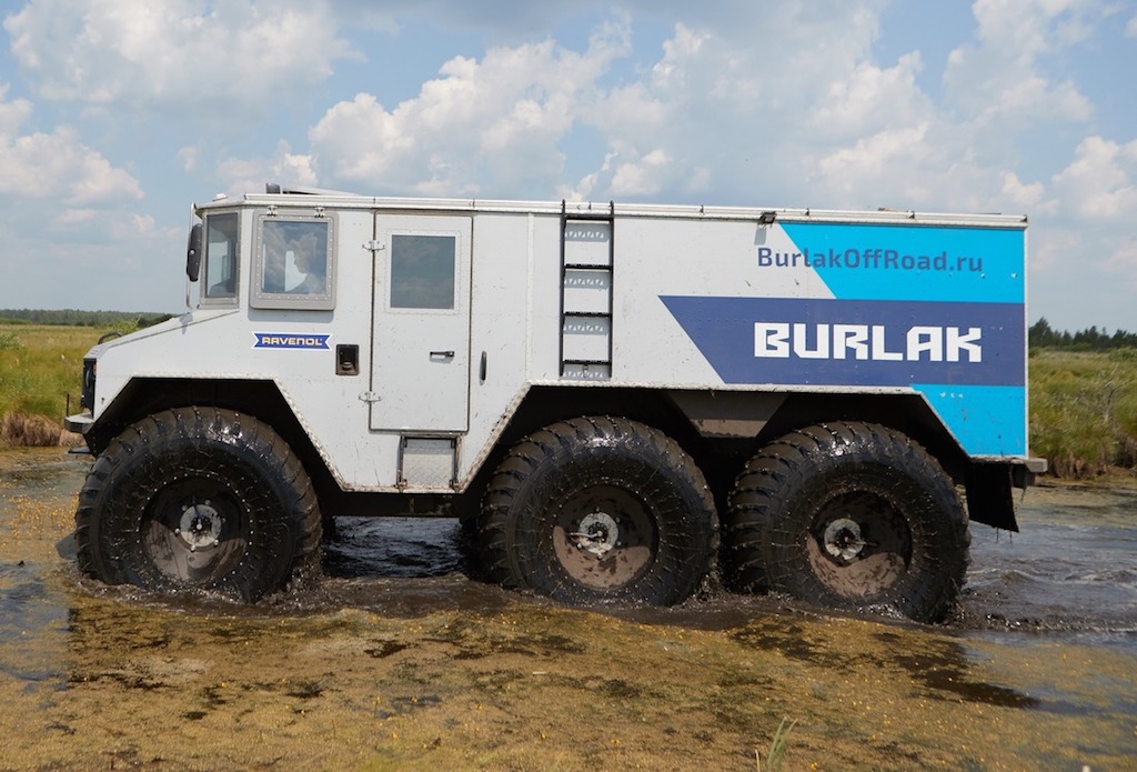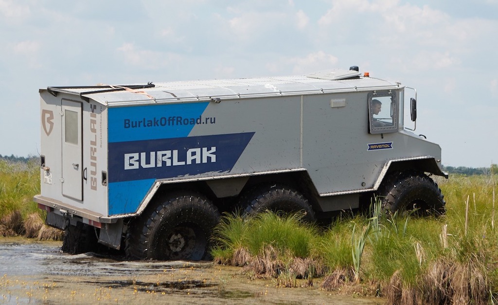 Машину предоставила для испытаний научно-производственная фирма «Технотранс» (г. Курган). Амфибия-снегоболотоход оснащен силовым агрегатом мощностью 150 лошадиных сил. Он может перевозить бригаду из 4–6 человек. Два спальных места предусмотрены в кабине за водительским сидением, еще четыре — в пассажирском отсеке. Вместимость основного и вспомогательных топливных баков составляет 700 литров, что позволяет без дозаправки преодолевать значительные расстояния. В общей сложности в ходе двухмесячных испытаний «Бурлак» прошел порядка двух тысяч километров.