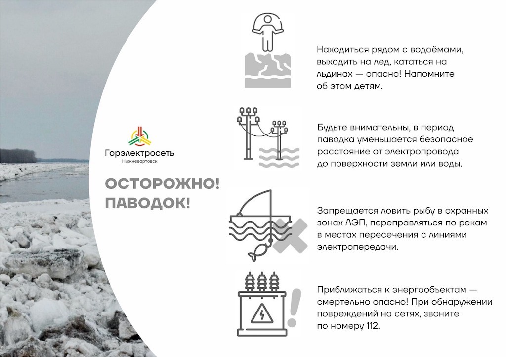 Производственно-диспетчерская служба «Горэлектросеть» напоминает: о любых обнаруженных повреждениях (подмывах опор, обрывах проводов на линиях электропередачи и подтоплении электрооборудования) нужно сообщать по тел.: (3466) 26-07-78, 26-08-85 или по единому номеру экстренных служб 112.