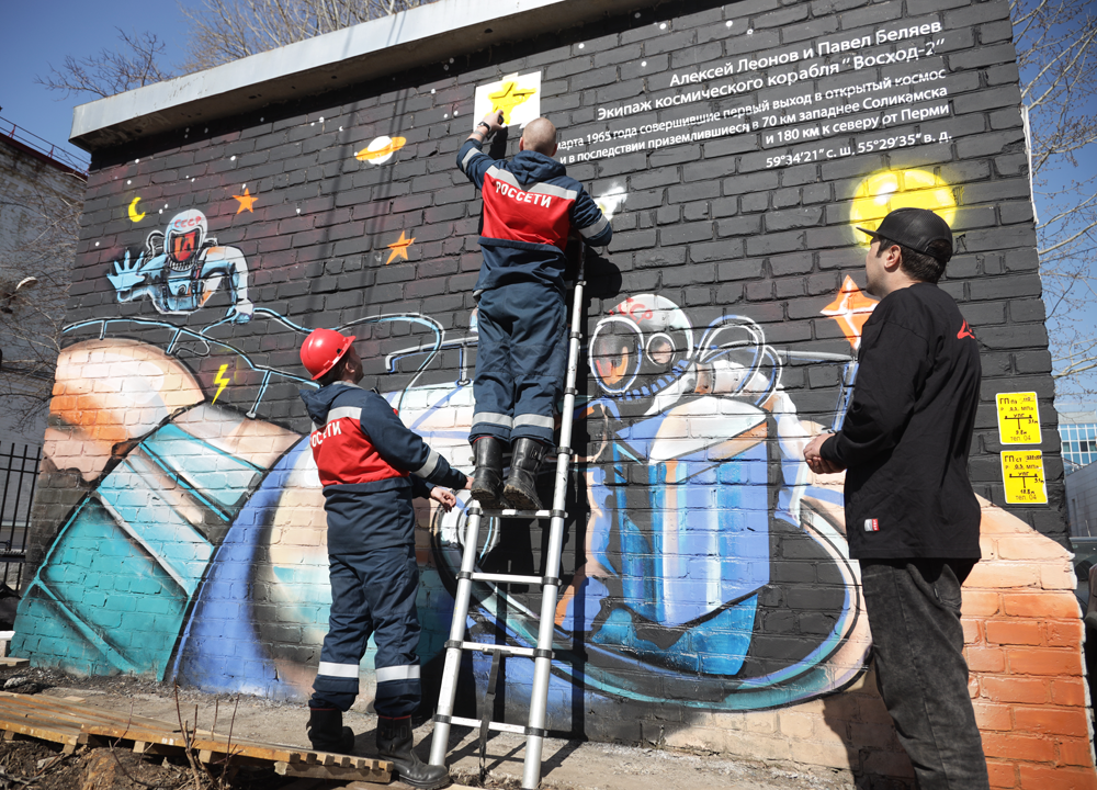 В Перми художник Вячеслав Каменских изобразил космонавтов – членов экипажа космического корабля «Восход-2» Павла Беляева и Алексея Леонова, которые 18 марта 1965 года впервые в истории совершили выход в открытый космос. По завершению задания они осуществили приземление на территории Пермского края. Арт украсил стену трансформаторной подстанции на пересечении улиц Советская и Свердловская.