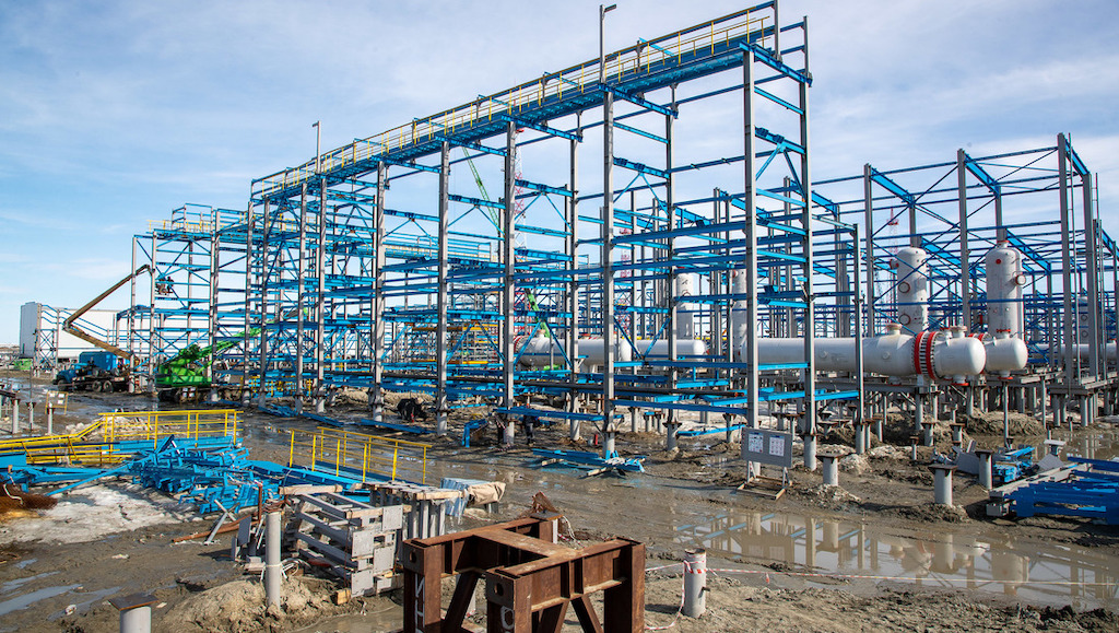 На территории установки комплексной подготовки газа возведены каркасы зданий и сооружений, смонтирована обвязка аппаратов воздушного охлаждения газа, смонтированы трубопроводные эстакады.