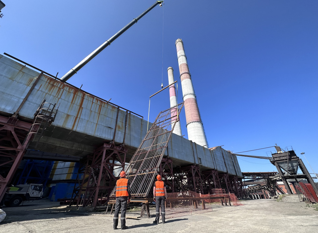 Все необходимые для ремонта электрофильтра материалы — на площадке. Работа идет 6 дней в неделю. Плановые сроки реализации проекта на электрофильтре №14 — конец августа.