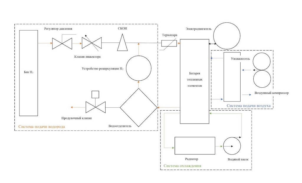 Ученые представили разработанную схему испытательного стенда для энергосиловой установки, мощность которой составляет до 150кВт. Разработка отвечает всем требованиям безопасности при проведении испытаний. В схеме определены все технические модули стенда, такие как система подачи водорода, система охлаждения, система подачи воздуха, силовая установка и блок для моделирования потенциальной нагрузки на электродвигатель транспортного средства.