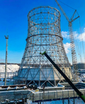 Градирня приобретает окончательные очертания — каркас готов, начат монтаж панелей.
