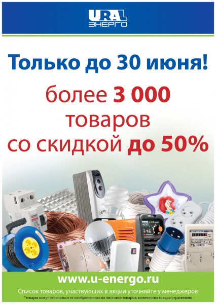 Уважаемые партнеры! Предлагаем Вашему вниманию акцию: только до 30 июня приобретайте продукцию в компании «Уралэнерго» и получайте скидку до 50%. Скидка распространяется на 3000 товаров. Список товаров, участвующих в акции необходимо уточнять у менеджеров продаж.