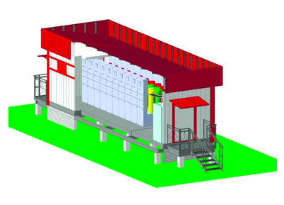 Особые требования предъявляются к механической прочности модулей с элегазовыми ячейками 110 кВ. Здание представляет собой надежную конструкцию с усиленным монолитным основанием, с негорючим утеплителем стен, поддерживающим температуру в помещении +20ºС при температуре окружающего воздуха от – 60ºС до + 45ºС. Учитывая, что элегаз негорюч, не нужно разделять помещения с элегазовыми ячейками противопожарными перегородками. В каждом здании предусмотрены освещение, автоматическое включение обогревателя или кондиционера, а также вентиляция, системы охранной и пожарной сигнализации.