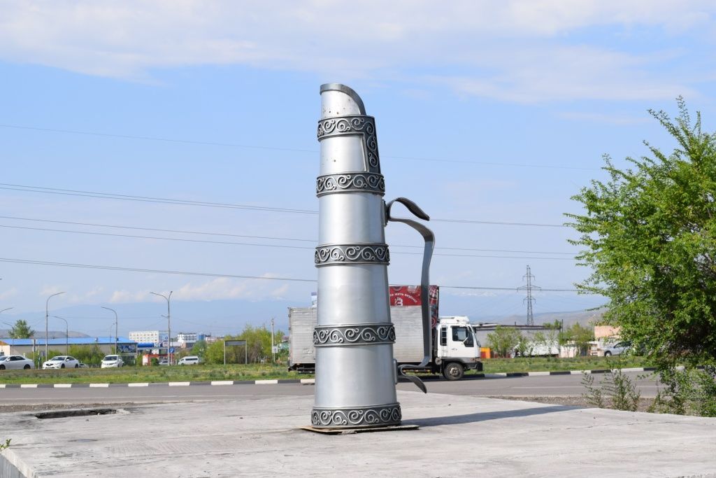 Уже через год энергетики Кызылской ТЭЦ подарили городу еще один арт-объект и тоже с теплой гостеприимной символикой. Речь идёт о металлическом кувшине, который предки современных тувинцев использовали для разлива чая. Называется эта разновидность чайника «домбуу», и его трехметровое воплощение установлено возле круговой развязки на одной из магистральных тепловых камер.