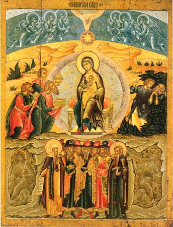 Пречистая Богомати, Богородице,/ Собор Твой честный украшен многоразличными добротами, / дары Ти приносят, Госпоже, многи мирстии людие, / Узы наша грешныя раздери Своею милостию/ и спаси души наша.