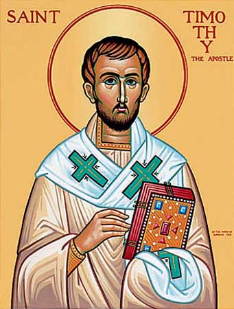 Святой апостол Тимофей происходил из Ликаонского города Листры в Малой Азии. Он был обращен ко Христу в 52 году святым апостолом Павлом. Когда апостолы Павел и Варнава посетили впервые Ликаонские города, апостол Павел в Листре исцелил хромого от рождения, и многие жители города уверовали во Христа, среди них был и будущий апостол, юноша Тимофей, его мать Евника и бабка Лоида. Семена веры, посеянные апостолом Павлом в душе святого Тимофея, принесли обильный плод. Он стал ревностным учеником апостола, а впоследствии его неотлучным спутником и сотрудником в проповеди Евангелия. Апостол Павел любил святого Тимофея и называл его в Посланиях своим возлюбленным сыном, с благодарностью вспоминая его верность и преданность. Он писал Тимофею: "Ты последовал мне в учении, житии, расположении, вере, великодушии, любви, терпении, в гонениях, страданиях...". В 65 году апостол Павел рукоположил апостола Тимофея во епископа Ефесской Церкви, которой святой Тимофей управлял 15 лет. Святой апостол Павел, находясь в Риме в темнице и зная, что ему предстоит мученический подвиг, вызвал к себе верного ученика и друга апостола Тимофея на последнее свидание. Святой Тимофей закончил жизнь мученически. В Ефесе язычники совершали праздник в честь идолов и носили их по городу, сопровождая нечестивыми обрядами и песнями. Святой епископ Тимофей, ревнуя о Славе Божией, старался останавливать и вразумлять ослепленных идолопоклонством людей, проповедуя им истинную веру во Христа. Язычники в озлоблении бросились на святого апостола, били его, влачили по земле и, наконец, побили камнями. Мученическую смерть за Христа святой апостол Тимофей воспринял в 80-м году. В IV веке святые мощи апостола Тимофея были перенесены в Царьград и положены в храме Святых Апостолов. Святая Церковь чтит святого Тимофея в числе 70-ти апостолов.