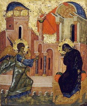 Пребывая в доме Своего Обручника старца Иосифа, Пресвятая Дева Мария однажды читала Книгу пророка Исаии и размышляла о величии Той, Которая удостоится быть Матерью Бога. Всем сердцем Святая Мария хотела увидеть Избранницу Божию и в глубоком смирении желала быть последней Ее служанкой. В тот благословенный день начала человеческого спасения, ставший днем воплощения Бога Слова, Пресвятой Деве Марии с небес явился посланный Богом Архангел Гавриил и приветствовал Ее словами: «Радуйся, Благодатная, Господь с Тобою; благословенна Ты между женами». Она же, увидев его, смутилась от слов его и размышляла, что значит это приветствие.