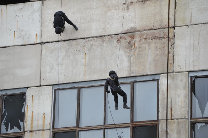 Между тем, бойцы спецназа, спустившиеся на тросах с верхнего этажа, зависли над окнами занятого условными «террористами» помещения, причем некоторые из них закрепились на стене вниз головой, изготовившись к стрельбе в окна.