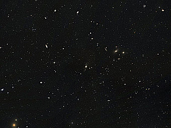 В рамках исследования ученые наблюдали галактическое скопление, которое расположено на расстоянии 50 миллионов световых лет от Земли в созвездии Девы. В этом регионе пространства сосредоточено несколько сотен галактик, включая крупные эллиптические, к которым относится Messier 87. В частности, исследователей интересовали планетарные туманности - скопления ионизированного газа вокруг белых карликов, которые являются результатом сброса внешней оболочки красным гигантом на последнем этапе развития звезд средней массы. Данные туманности удобны для наблюдения позволяют получать данные о движении звезд в удаленных регионах космоса. Наблюдения за туманностями проводились при помощи спектрографа FLAMES, установленного на телескопе VLT. В настоящее время ученые не могут объяснить, что обрезало гало Messier 87. На этот счет у них имеется несколько гипотез. Согласно одной отсутствие звезд обусловлено взаимодействием с другими галактиками скопления. Согласно другой, виновата темная материя, которая по современным представлениям, наполняет галактическое гало. Кроме этого ученые установили, что Messier 87 в будущем столкнется со своим соседом - галактикой Messier 86. Это событие должно произойти в ближайший миллиард лет, передает Lenta.ru. Регион неба, который наблюдали астрономы. Фото с сайта ESO