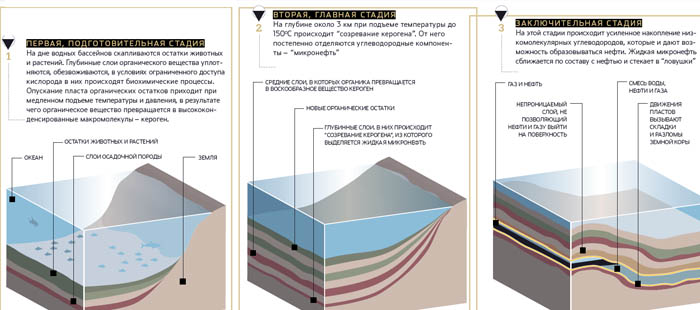 Как известно, в ученом мире существует две теории происхождения нефти: биогенная и абиогенная. Ни та, ни другая теория до конца не доказаны, однако большинство специалистов придерживаются биогенной теории. Она гласит, что нефть и природный газ образовались из остатков растительных и животных организмов в ходе многоступенчатого, длящегося миллионы лет процесса. Согласно этой теории, одним из основоположников которой был Михайло Ломоносов, запасы нефти невосполняемы и все ее месторождения когда-нибудь иссякнут.