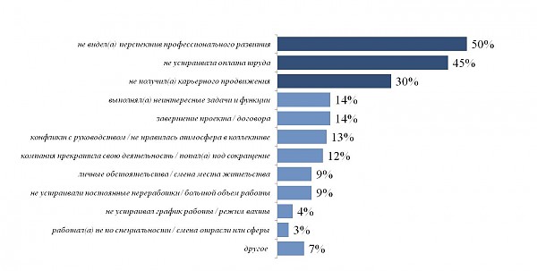 Наиболее частыми причинами смены работы, кандидаты считают отсутствие перспектив профессионального развития и карьерного продвижения, а также недостаточный уровень оплаты труда.