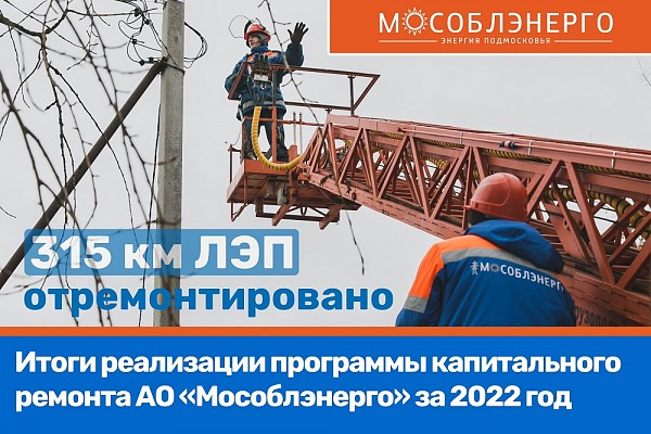 По программе капитального ремонта в 2022 году АО «Мособлэнерго» отремонтировало 287 зданий и заменило оборудование 240 трансформаторных подстанций и распределительных пунктов. От веток деревьев и кустарников расчищено 226,2 га охранных зон вдоль трасс воздушных линий электропередачи.