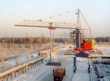 Производительный поворотный кран-погрузчик на портале грузоподъемностью 12,5 тонн будет осуществлять погрузо-разгрузочные и складские работы на производственной базе Ванкорского нефтяного месторождения, расположенного в Заполярье севернее порта Игарка.