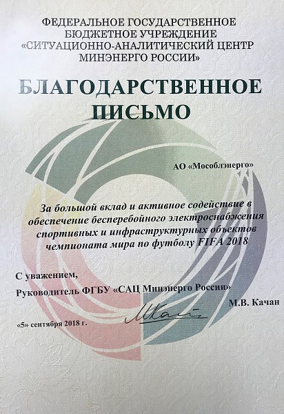 Главная / Новости / Пресс-релизы / «Мособлэнерго» получило благодарность за бесперебойное обеспечение Чемпионата мира по футболу