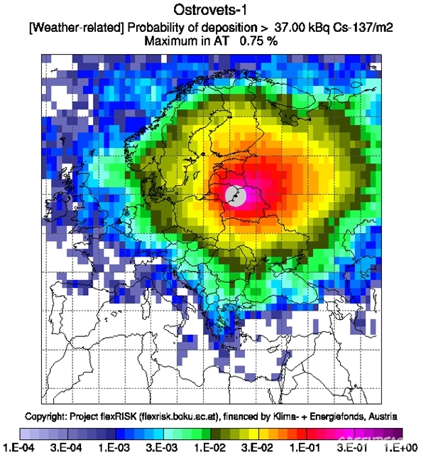 Австрийские учёные из FlexRISK недавно опубликовали карты возможного загрязнения при авариях на различных европейских АЭС, в том числе на строящейся АЭС в Островце (Беларусь). Согласно их исследованиям, под воздействие радиоактивного выброса попадут не только территории Беларуси и Литвы, но и регионы России: в первую очередь, Калининградская, Брянская, Смоленская, Псковская и Ленинградская области.