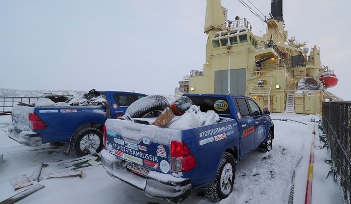 31 января капитан атомного ледокола «Таймыр» Павел Волков взял на борт участников экспедиции и автомобили. Ледокол доставил их в порт Дудинка.