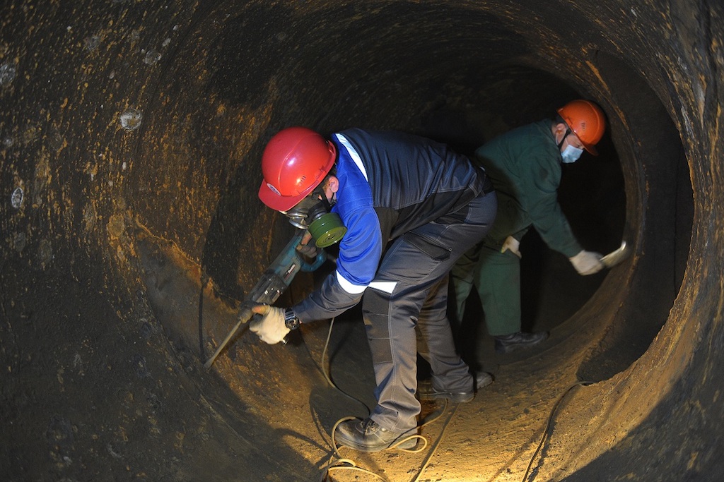 Внутри действующих циркуляционных технических водоводов, подводящих охлаждающую воду из Белоярского водохранилища, специалисты протянут новые трубы из стеклопластика методом т.н. релайнинга.