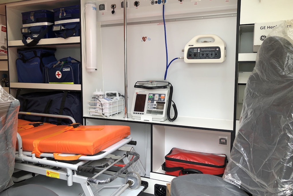 Это современный комплекс на колесах для бригад скорой медицинской помощи. Здесь установлены: дефибриллятор-монитор, электрокардиограф, пульсоксиметр, аппарат ИВЛ, редуктор-ингалятор кислородный, насос инфузионный шприцевый, наборы для оказания реанимационной, акушерской, хирургической, травматологической и других видов неотложной медицинской помощи.