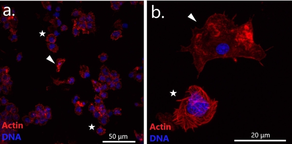 Визуализация клеток крови (гемоцитов) мидии, страдающей диссеминированной неоплазией. Раковые клетки отмечены звездочками