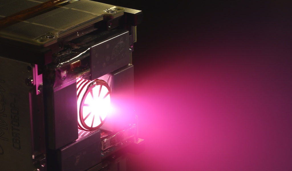 Испытания плазменной двигательной установки наноспутника «Святобор 1». На фото – поток плазмы, истекающий из двигателя и создающий тягу