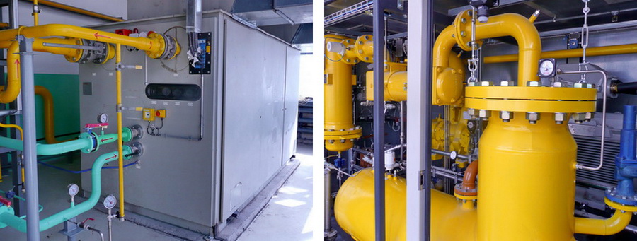 Компримирование и подачу топливного газа в турбины ГТУ под рабочим давлением 2,7 МПа осуществляет газодожимная станция «ЭНЕРГАЗ» в составе двух компрессорных установок (КУ) винтового типа. Технологической схемой КУ предусмотрено устойчивое поддержание проектной температуры газового топлива. Единичная производительность агрегатов – 4 500 м3/ч.