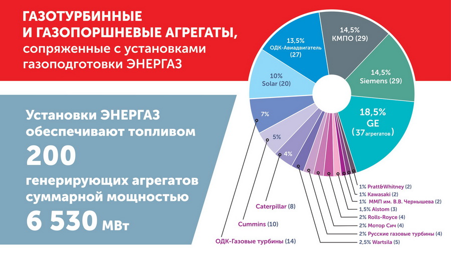 В электроэнергетике на 76 генерирующих объектах оборудование «ЭНЕРГАЗ» обеспечивает качественным топливом газотурбинные и газопоршневые агрегаты ведущих отечественных и мировых производителей. Число таких энергоагрегатов достигло 200. Диапазон их единичной мощности составляет от 1,2 до 187 МВт, суммарная электрическая мощность превысила 6,5 гигаватт (рис. 2). В эту статистику не входят агрегаты, проходящие заводское тестирование на испытательных стендах ПАО «Протон - Пермские моторы», АО «ОДК - Газовые турбины», ЗАО «Невский завод» и ПАО «ОДК-УМПО», которые также получают топливо от установок газоподготовки.