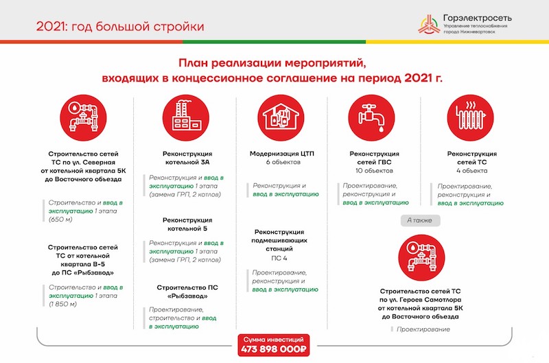 Именно 2021-й станет годом больших строек. Предстоит ввести в эксплуатацию 2,5 км. Новых теплосетей, реконструировать две самые мощные котельные (3А и 5), полностью модернизировать 6 центральных тепловых пунктов, построить подмешивающую станцию «Рыбозавод», реконструировать ещё одну ПС и 14 объектов теплоснабжения и горячего водоснабжения. Стоимость мероприятий 2021 года - 474 млн рублей. Всего в рамках выполнения инвестиционной программы концессионер вложит в модернизацию тепловой системы Нижневартовска за 10 лет до 2029 года 4,5 миллиарда рублей.