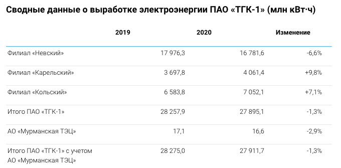 При этом производство электроэнергии гидроэлектростанциями увеличилось на 13,5%, сопоставимая выработка электроэнергии на тепловых электростанциях ПАО «ТГК‑1» снизилась на 11,7%.