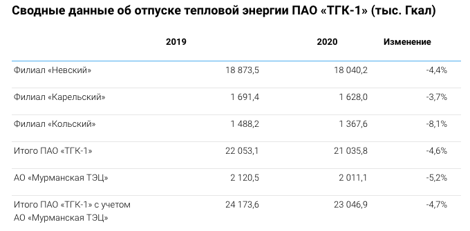 Объем отпуска тепловой энергии с коллекторов ПАО «ТГК-1», включая АО «Мурманская ТЭЦ», составил 23 046,9 тыс. Гкал, показав снижение на 4,7% относительно 2019 года в основном в связи с более высокими температурами наружного воздуха в течение отопительного сезона 2020 года.