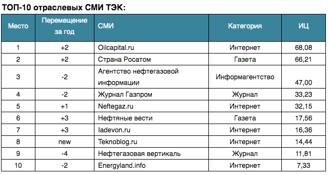 В рейтинг вошли медиаресурсы отрасли ТЭК. Основой для построения рейтинга стал Индекс Цитируемости (ИЦ) «Медиалогии».