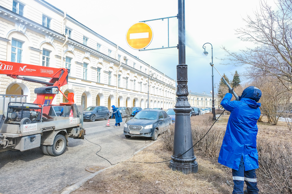 К майским праздникам чистыми станут свыше 14 тысяч опор освещения, в том числе покраске подлежат 5800 опор, 8150 консолей и цоколей. Помывка и покраска оборудования ведется при плюсовой температуре. В дождливую погоду опоры и пункты питания уличного освещения чистят от несанкционированной рекламы, объявлений, локально закрашиваются граффити.