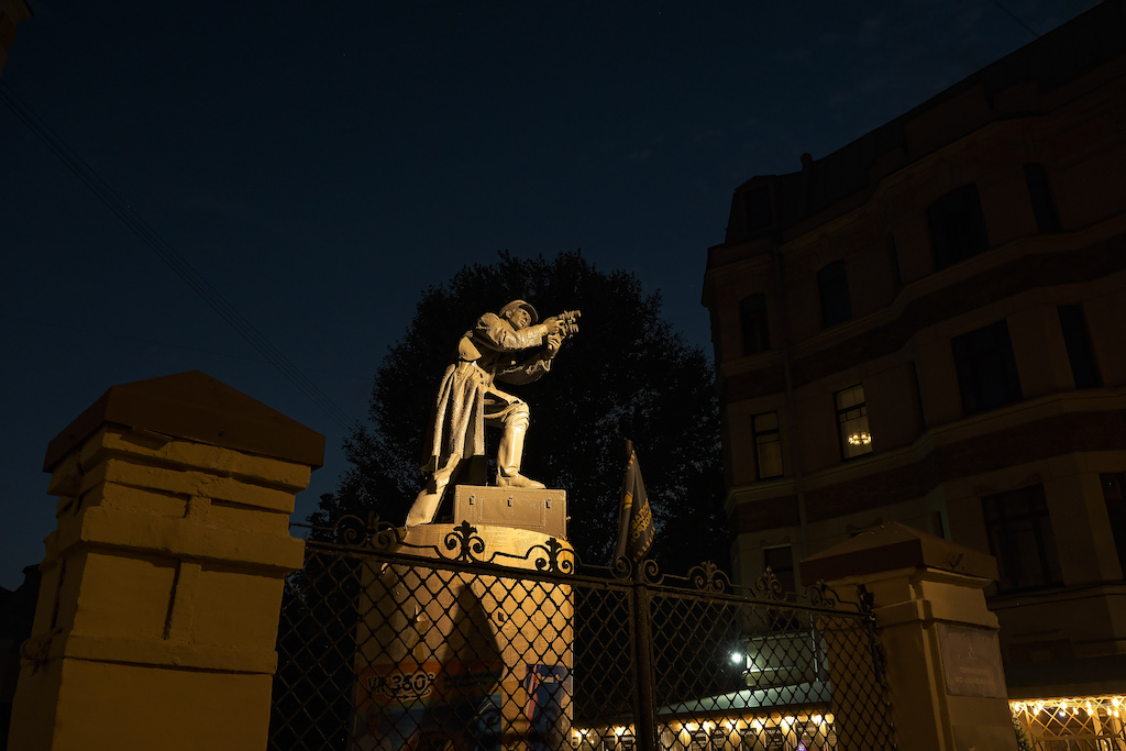 С подсветкой памятник гармонично сливается с вечерней панорамой города, обращает внимание на расположенную рядом с входом территорию киностудии «Ленфильм». Благодаря удачному расположению скульптура кинооператора в военной форме хорошо просматривается со всех сторон. Подсветка организована естественно, светом обозначены форма и фактуры жанровой композиции.