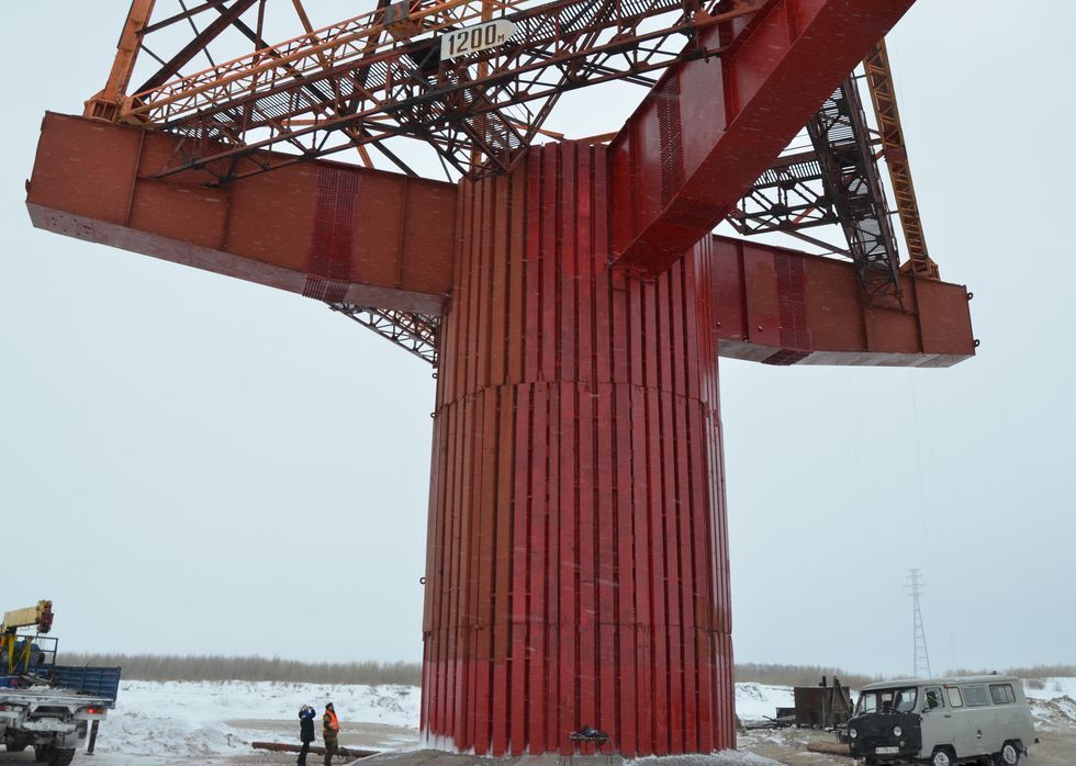 Пока работали насосы было пробурено 111 скважин глубиной 20 метров и диаметром 1 метр. В каждую из этих скважин были установлены железобетонные сваи. На этом мощнейшем свайном основании возведен 25-метровый железобетонный устой с крестовой площадкой, на которой стоит 140-метровая 300-тонная металлическая красавица, состоящая из 9 секций, установленных друг на друга. Строительство русловой опоры было завершено в 1992 году.