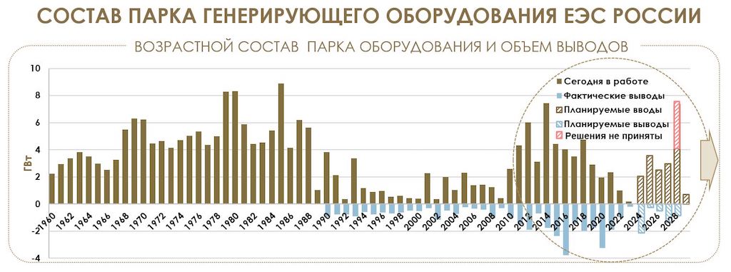 «С учетом старения парка имеющегося оборудования поддержание достаточной для развития экономики электрогенерации требует до 5 ГВт новых вводов либо глубокой модернизации ежегодно. Эти цифры складываются из необходимости обеспечивать перспективный рост потребления в среднем до 2% в год и постепенную замену генерации, построенной в 60–80-х годах прошлого века, поддерживать работоспособность которой становится неэффективным или невозможным», - отметил Федор Опадчий.