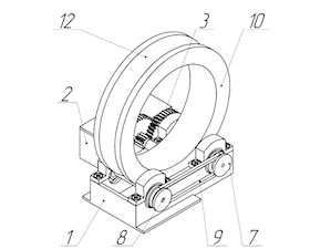 Разработка включает в себя корпус, где установлены привод с электродвигателем и цилиндрический редуктор, а также опорные валы, на которых размещаются сами кольца подшипника. Валы, в свою очередь, связаны ременной передачей (ремнем). Конструкция устройства обеспечивает медленное вращение валов с одинаковой заданной скоростью.