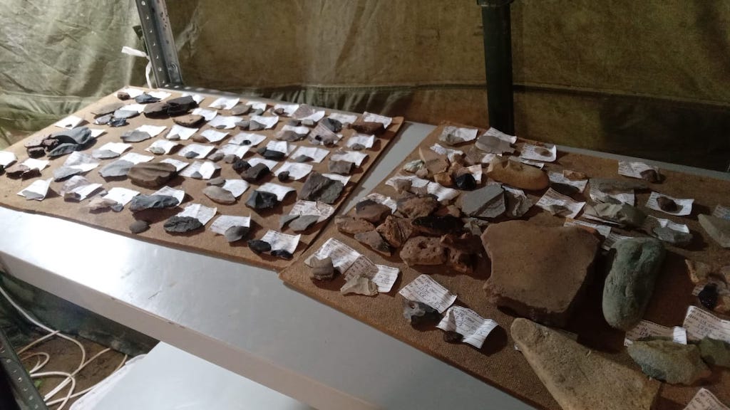 Археологи исследуют два участка общей площадью 500 кв. м, где предположительно располагалась стоянка рыболовов эпохи неолита. Среди находок обнаружены каменные грузила и наконечники гарпунов, каменные топоры, подвеска из гагата (редкий материал для украшений того периода), фрагменты керамических сосудов.