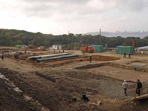 Завершены работы по устройству фундамента здания закрытого распределительного устройства ЗРУ-10 кВ и кирпичной кладке стен. Построен противопожарный резервуар, завершена кирпичная кладка стен насосной станции пожаротушения, выполнена установка противопожарных перегородок трансформаторного оборудования, начаты работы по строительству здания общеподстанционного пункта управления (ОПУ), завершается сооружение фундамента КРУЭ 110 кВ.