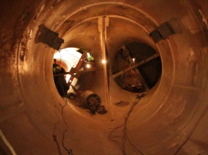 В ближайшие дни гидростроители начнут спуск других звеньев колена - участка вертикальной шахты, переходящего к двум горизонтальным водоводам. Используемые трубы диаметром 3,6 м изготавливаются из листовой стали повышенной прочности толщиной до 6 см. Вес сдвоенного звена составляет до 25 тонн.