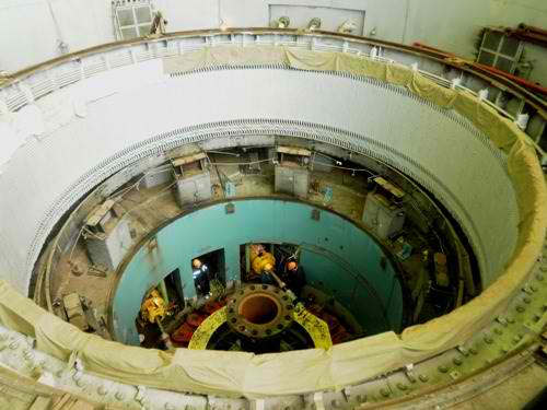 В настоящее время силами двух основных цехов идет сборка гидроагрегата. Установлено рабочее колесо, крышка турбины, лопатки направляющего аппарата с кинематикой. По завершении полной сборки персонал приступит к центровке гидроагрегата – проверке перпендикулярности диска подпятника к валу генератора.
