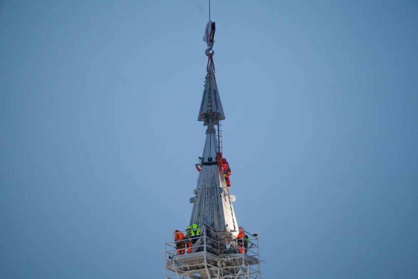 Завершился монтаж шпиля башни возводимого в Санкт-Петербурге многофункционального комплекса Лахта Центр, в котором разместится штаб-квартира группы «Газпром». На вершине небоскреба зажглись авиационные огни.